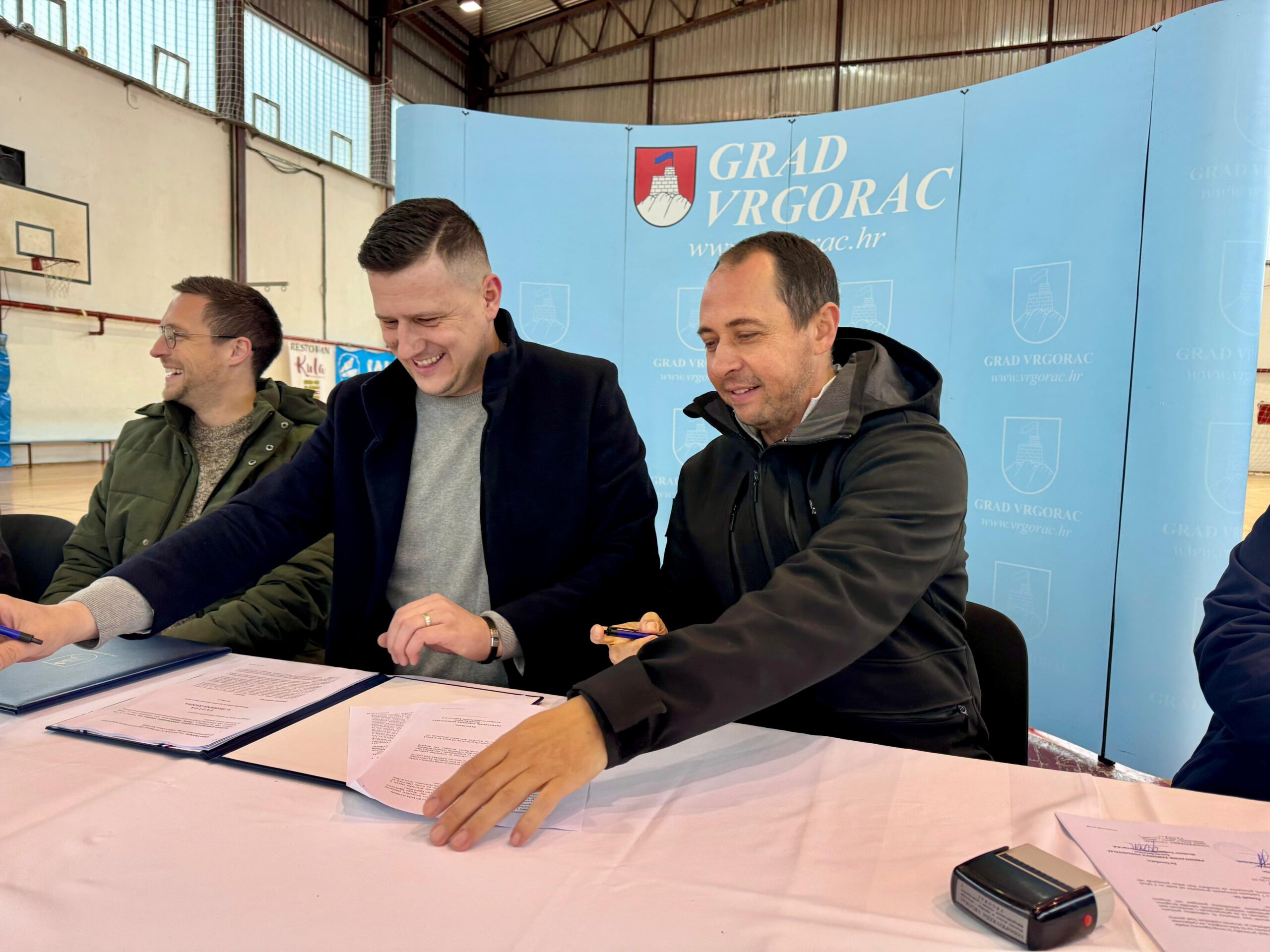 Potpisivanju su prisustvovali gradonačelnik Grada Vrgorca Mile Herceg, izvođači radova – zajednica ponuditelja, Goran Šeremet, direktor tvrtke Vodoprivreda Vrgorac i Ivica Galić, direktor tvrtke Degal Tehnika, zatim Ivan Kišić iz ADL struktura, tvrtke zadužene za stručni nadzor i Toni Grljušić, direktor tvrtke Gradska čistoća i usluge, pod čijim je upravljanjem navedena sportska dvorana.