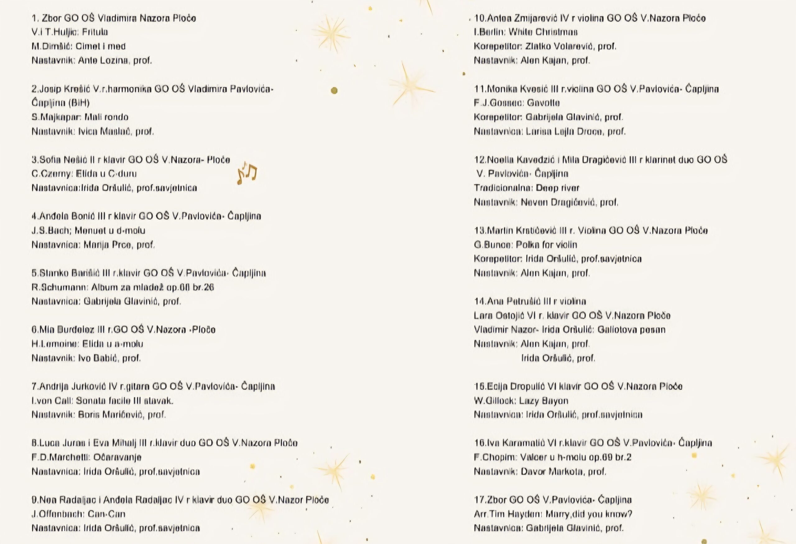 Publiku očekuje večer bogata blagdanskim ugođajem i glazbenim izvedbama učenika različitih odjela, koji će kroz zajednički program dodatno učvrstiti suradnju dviju škola i obogatiti adventska događanja u gradu.