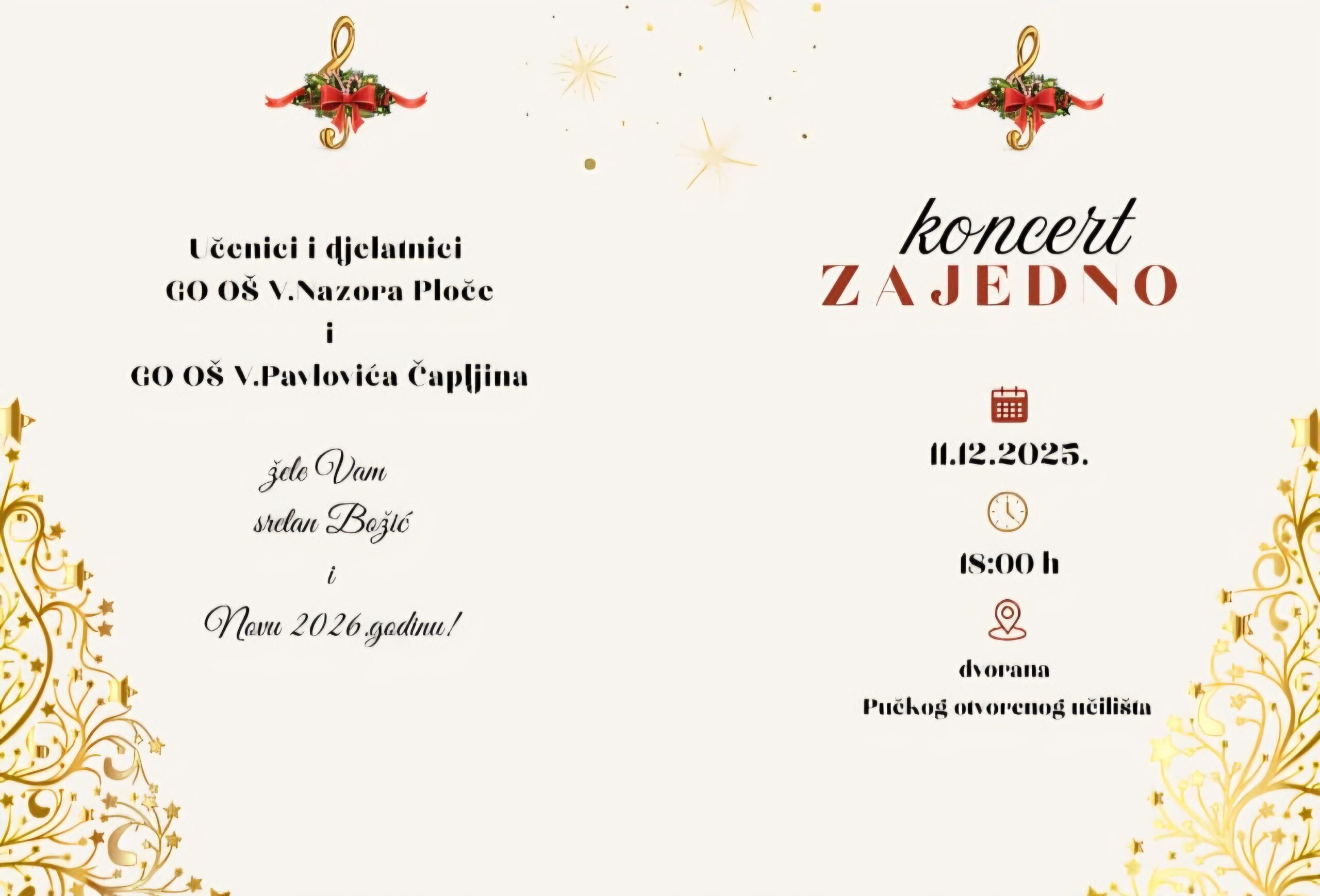 U četvrtak, 11. prosinca, s početkom u 18 sati, u dvorani Pučkog otvorenog učilišta Ploče održat će se zajednički adventski koncert učenika Osnovne glazbene škole pri OŠ Vladimir Nazor Ploče, uz sudjelovanje gostiju iz Glazbene škole Vladimira Pavlovića Čapljina.